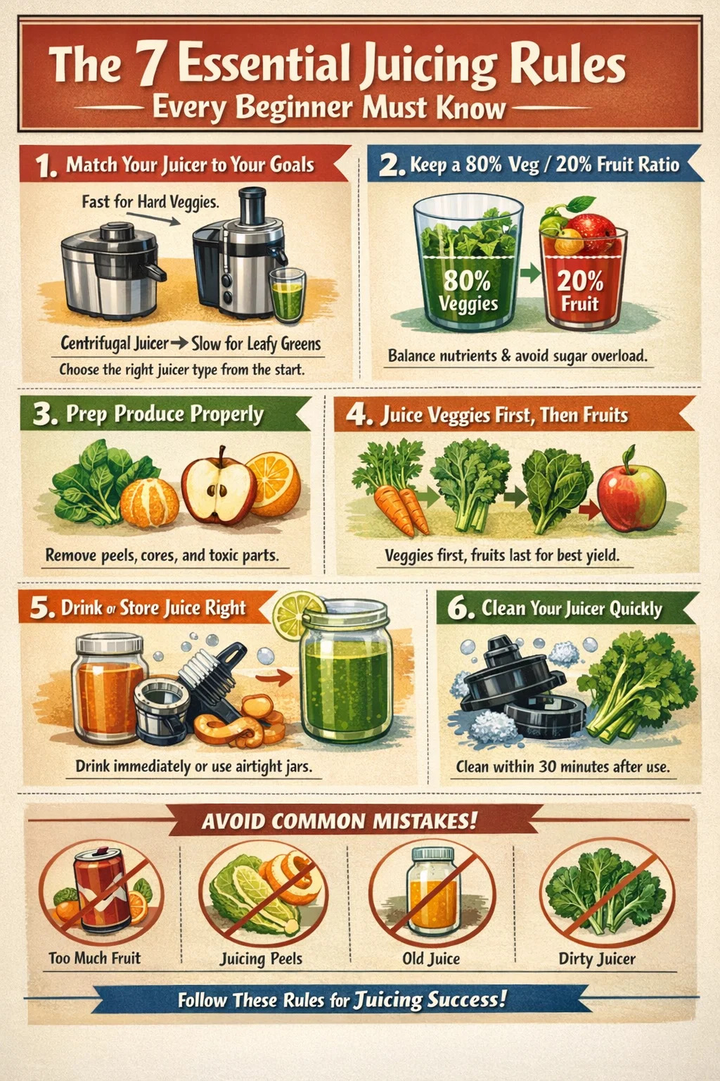 If you just bought your first juicer and have no idea where to start, here is the short answer: drink your juice within 20 minutes of making it, always juice vegetables before fruits, and clean your juicer immediately after every use. Those three habits alone will save you from the most common beginner mistakes. The seven rules below build on that foundation, covering everything from ingredient ratios to storage, so you get the most nutrition — and the most enjoyment — out of every glass.