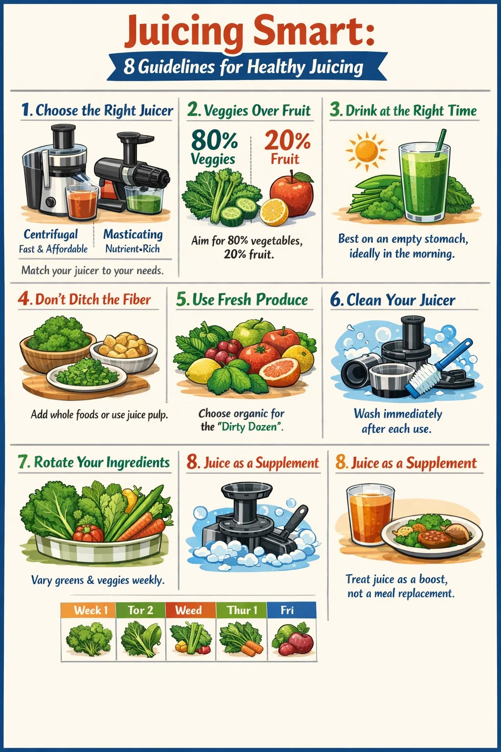 Il modello sostenibile prevede una porzione da 12-16 once di succo fresco al giorno, insieme a pasti regolari che forniscono un nutrimento completo. Nel tempo, questo tipo di abitudine costante e moderata di spremitura contribuisce in modo significativo all’assunzione complessiva di micronutrienti, supporta l’idratazione e aggiunge varietà a una dieta, senza i rischi di restrizione calorica o squilibrio nutrizionale.