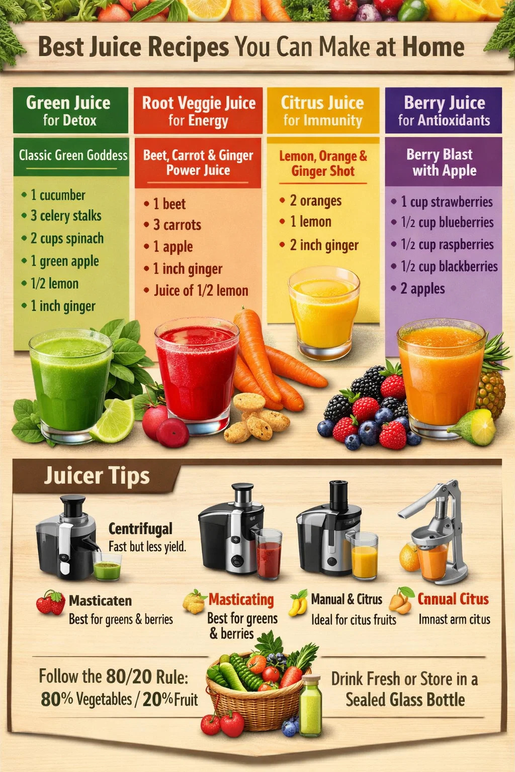 Il migliore diverso succo le ricette combinano frutta e verdura in modo approssimativo Rapporto 80% verdura e 20% frutta , fornendoti il massimo dei nutrienti senza zuccheri in eccesso. Sia che utilizzi uno spremitore centrifugo o uno spremitore a masticazione con spremitura a freddo, le categorie principali sono le stesse: succhi verdi, miscele di verdure a radice, miscele di agrumi, bevande a base di frutti di bosco e combinazioni tropicali. Ogni categoria ha uno scopo nutrizionale diverso e, una volta compreso lo schema, creare le proprie ricette da zero diventa semplice. Le sezioni seguenti esaminano tutti i principali tipi, con quantità esatte di ingredienti, dati sulla salute e consigli pratici che funzionano indipendentemente dallo spremiagrumi che possiedi.