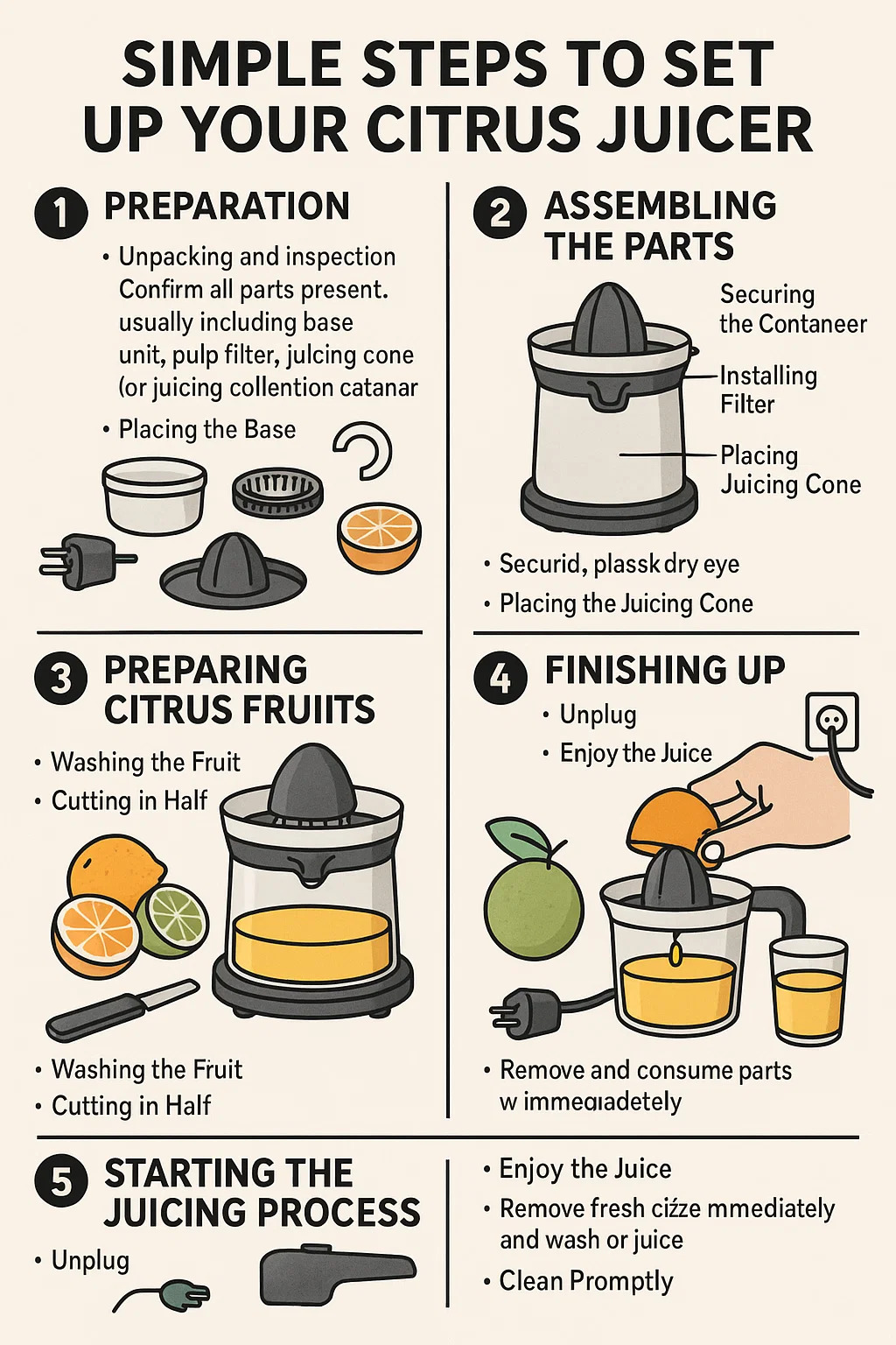 Disimballaggio e ispezione: per prima cosa, togli lo spremiagrumi dalla scatola. Confermare che tutte le parti siano presenti, solitamente inclusa l'unità base, il filtro per la polpa, il cono di spremitura (o la testa di spremitura) e il contenitore per la raccolta del succo.