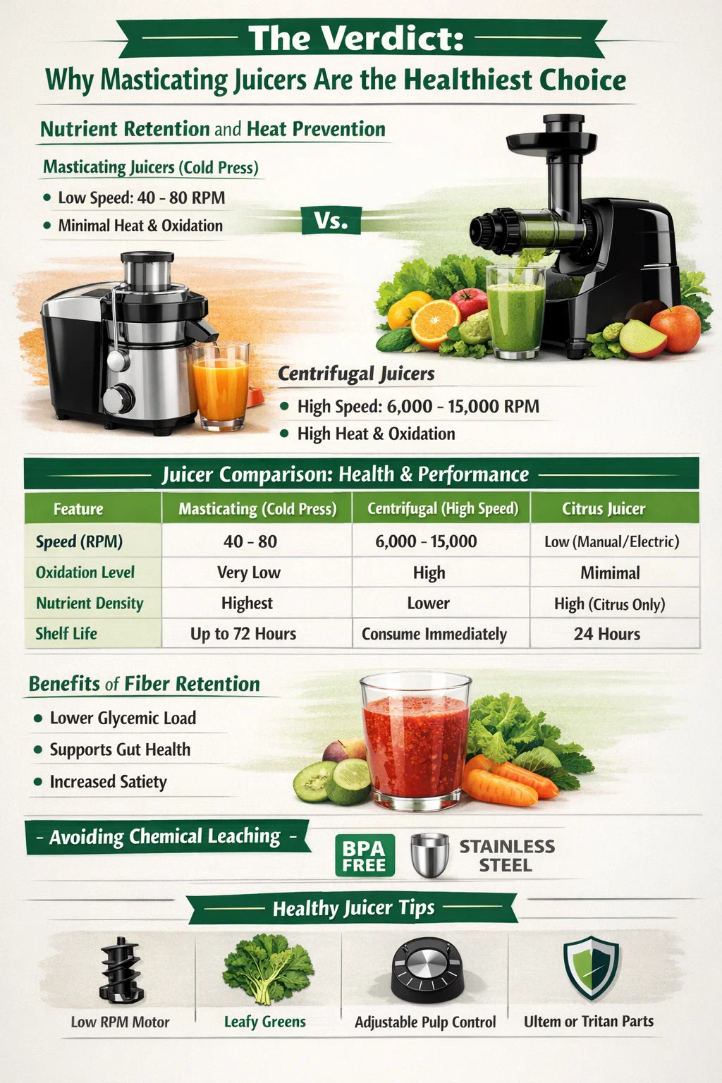 Quando si dà priorità alla salute e alla densità dei nutrienti, il Lo spremiagrumi masticatore (noto anche come spremitore a freddo) è il tipo di spremiagrumi più sano disponibile. A differenza dei modelli ad alta velocità, gli spremitori masticatori utilizzano una vite o una coclea a rotazione lenta per schiacciare frutta e verdura, che riduce al minimo l'attrito termico e l'ossidazione . Questo processo delicato garantisce che le vitamine delicate, i minerali e gli enzimi vivi rimangano intatti, fornendo una bevanda più potente dal punto di vista nutrizionale che può rimanere fresca fino a 72 ore.